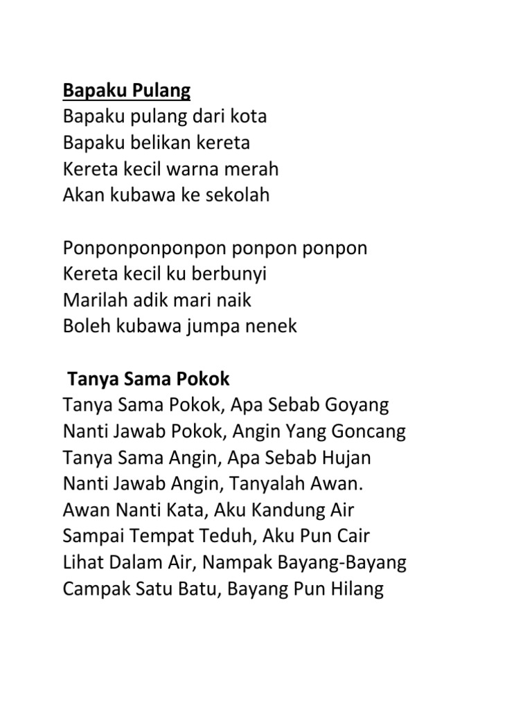 Koleksi Lirik Lagu Kanak-Kanak Bapaku Pulang Bapaku pulang dari kota Bapaku belikan kereta Kereta kecil warna merah Akan kubawa ke sekolah Ponponponponpon ponpon ponpon. Lirik Lagu Taman Kanak-Kanak. Apalagi belanja mahu bayar berian.